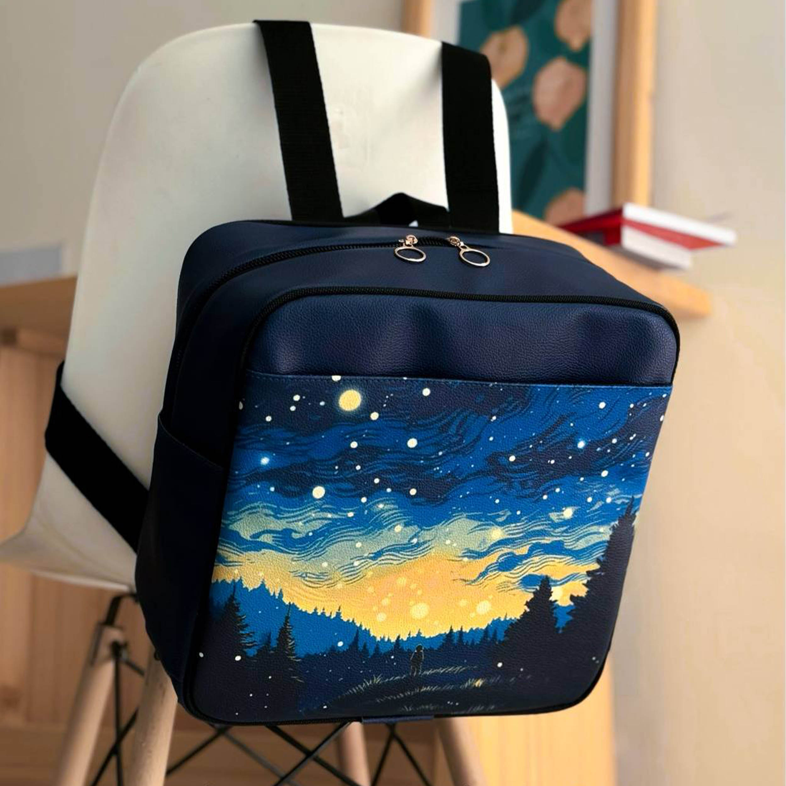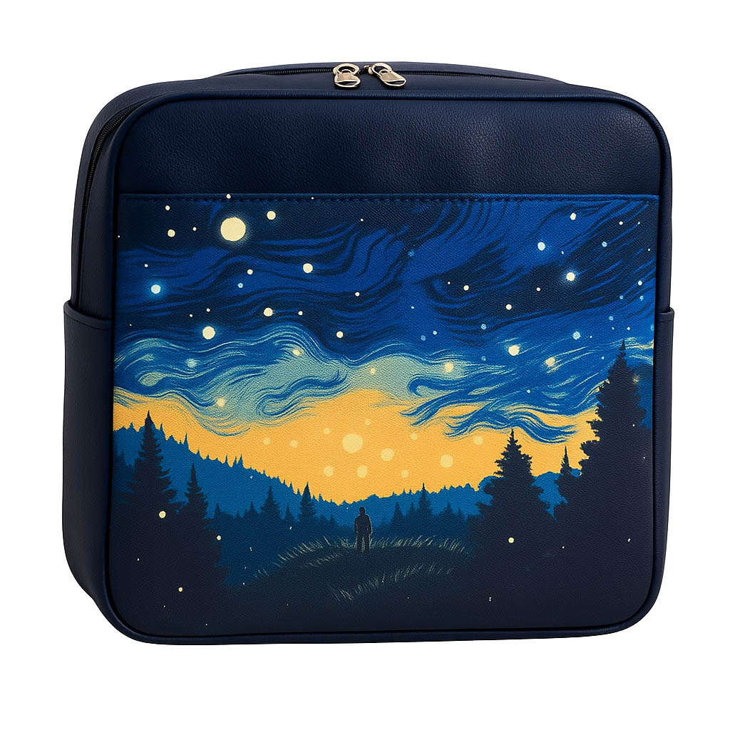کیف کوله آسمان شب با ابعاد ۳۰×۳۰ سانتیمتر و کفی ۱۵ سانتیمتری، از چرم مصنوعی باکیفیت ساخته شده و دارای آستر داخلی از جنس برزنتی محکم است. این کیف مجهز به بند برزنتی مقاوم بوده و با طراحی کاربردی خود، شامل جیبهای کناری و یک جیب داخلی برای نظمدهی بهتر به وسایل است. جنس مقاوم و قابل شستشوی آن، این کیف را به گزینهای مناسب برای استفاده روزمره و طولانیمدت تبدیل کرده است.